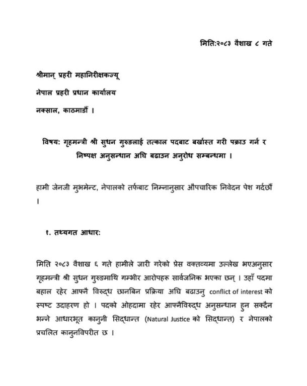 काठमाडौं-जेनजी मुभमेन्ट नेपालले गृहमन्त्री सुधन गुरुङलाई तत्काल पदबाट बर्खास्त गरी पक्राउ गर्न र निष्पक्ष अनुसन्धान अघि बढाउन माग गर्दै प्रहरी प्रधान कार्यालयमा निवेदन दिएको छ।