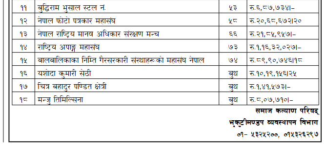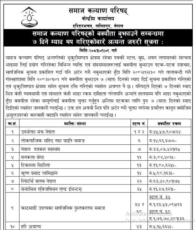 काठमाडौं-समाज कल्याण परिषद्ले भृकुटीमण्डप क्षेत्रमा रहेका पक्की स्टल, बुथ, भवन लगायतका संरचना प्रयोग गरेबापत भाडा रकम नबुझाउने १८ जना व्यक्ति तथा संघ-संस्थाको नाम सार्वजनिक गरेको छ। उनीहरूलाई एक सताभित्रमै भाडाबापतको बक्यौता बुझाउन परिषद्ले ताकेता गरेको हो।