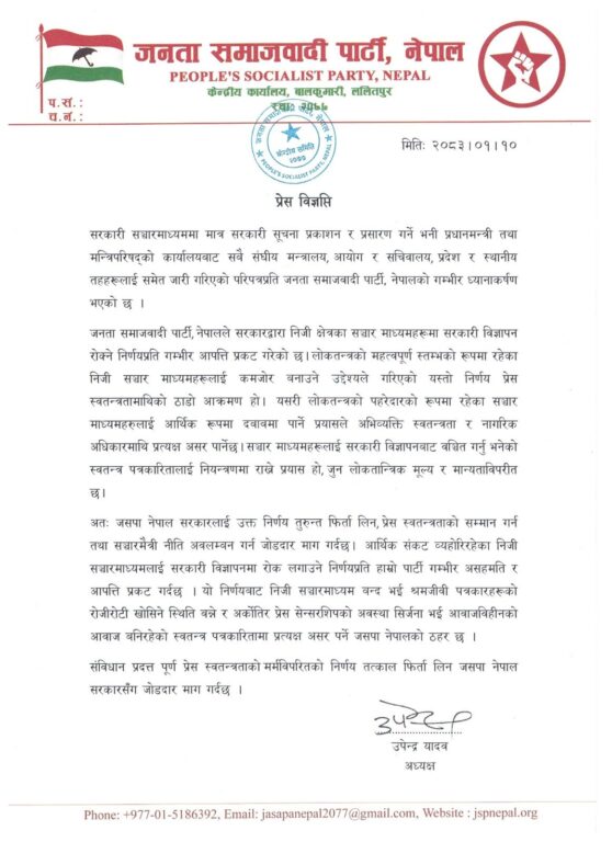 काठमाडौँ-सरकारले निजी क्षेत्रका सञ्चारमाध्यमहरूलाई सरकारी विज्ञापन र सूचना उपलब्ध नगराउने गरी गरेको निर्णयप्रति जनता समाजवादी पार्टी (जसपा), नेपालले कडा आपत्ति जनाएको छ।