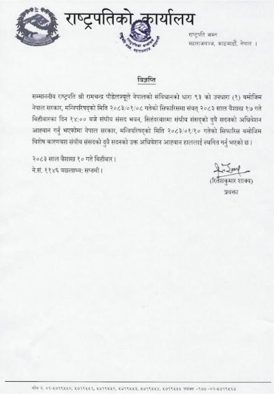 राष्ट्रपति रामचन्द्र पौडेलज्यूले नेपालको संविधानको धारा ९३ को उपधारा (१) बमोजिम नेपाल सरकार, मन्त्रिपरिषद्को मिति २०८३/०१/०८ गतेको सिफारिसमा संवत् २०८३ साल वैशाख १७ गते बिहीबारका दिन १४:०० बजे संघीय संसद भवन, सिहंदरबारमा संघीय संसद्को दुवै सदनको अधिवेशन आह्वान गर्नु भएकोमा नेपाल सरकार, मन्त्रिपरिषद्को मिति २०८३/०१/१० गतेको सिफारिस बमोजिम विशेष कारणवश संघीय संसदको दुवै सदनको उक्त अधिवेशन आह्वान हाललाई स्थगित गर्नु भएको छ,’ विज्ञप्तिमा भनिएकाे छ ।