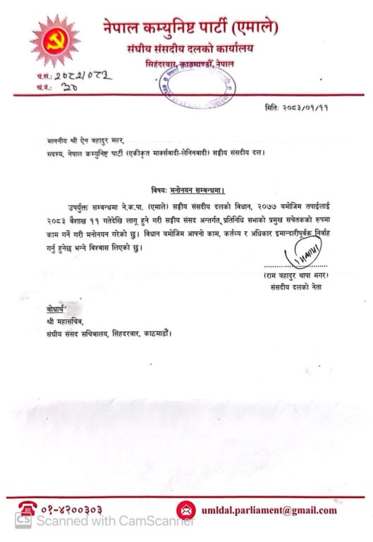 एमालेले यस मनोनयनबारे सङ्घीय संसद सचिवालयलाई समेत जानकारी गराइसकेको छ।