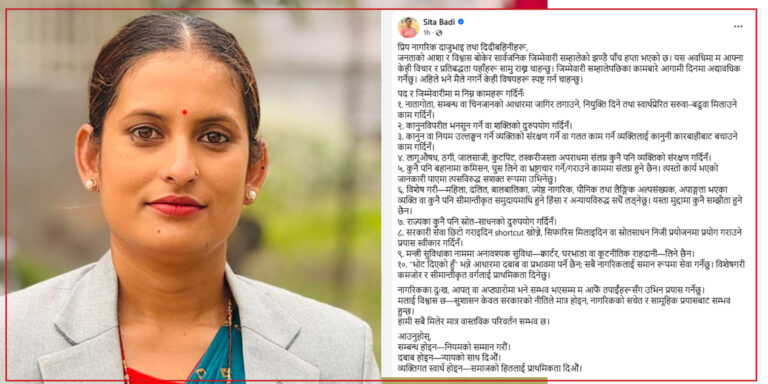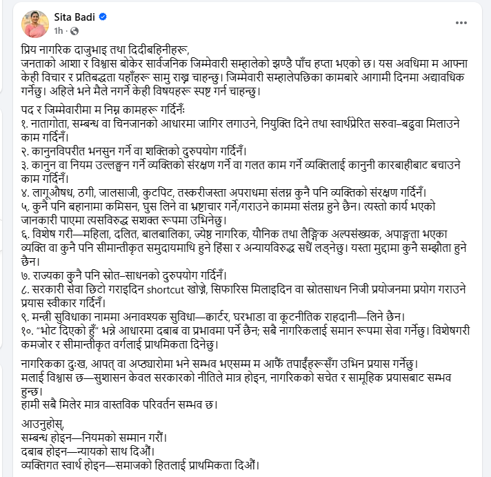 ‘जनताको आशा र विश्वास बोकेर सार्वजनिक जिम्मेवारी सम्हालेको झण्डै पाँच हप्ता भएको छ। यस अवधिमा म आफ्ना केही विचार र प्रतिबद्धता यहाँहरू सामु राख्न चाहन्छु,’ उनले भनेकी छन्, ‘जिम्मेवारी सम्हालेपछिका कामबारे आगामी दिनमा अद्यावधिक गर्नेछु।’