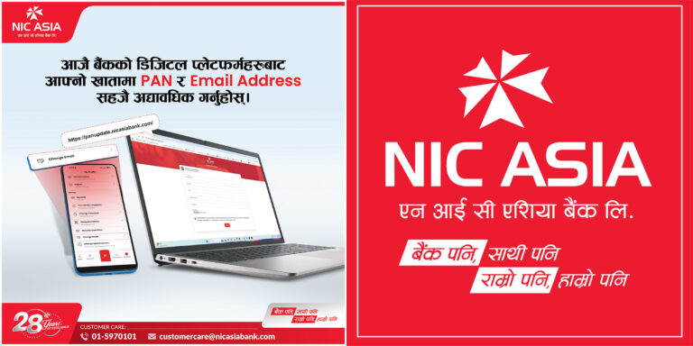 काठमाडौं-एनआईसी एशिया बैंकले आफ्ना ग्राहकहरूलाई आफ्नो खातामा स्थायी लेखा नम्बर (प्यान) र इमेल ठेगाना अद्यावधिक गर्न अनुरोध गरेको छ।