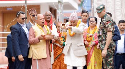 काठमाडौँ-राष्ट्रपति रामचन्द्र पौडेलले पशुपति क्षेत्रस्थित गुह्येश्वरी मन्दिरअघि बागमती किनारमा निर्माण गरिएको छठ पूजास्थल जानुभई सूर्यसहित