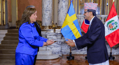 काठमाडौँ-ब्राजिलका लागि नेपालका राजदूत निर्मलराज काफ्लेले आज पेरुका राष्ट्रपति दिना एर्सिलिया बोलुआर्टे जेगारासमक्ष नेपालका गैरआवासीय