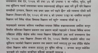 काठमाडौं- कानुनतः मदिरा, चुरो, सूर्ति तथा सूर्तिजन्य पदार्थको विज्ञापन गर्न पाइँदैन । जनस्वास्थ्य ऐन, २०७५