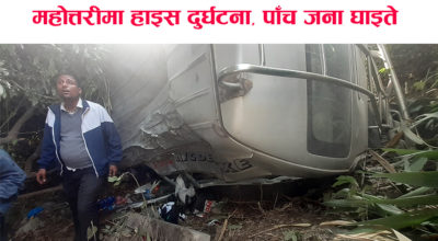 महोत्तरी- काठमाडौंबाट उदयपुर जाँदै गरेको बा३ख ९७८८ नम्बरको हाइस दुर्घटना हुँदा पाँच जना घाइते भएका