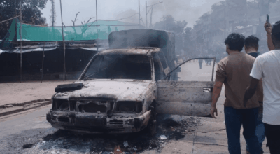 ललितपुरको मंगलबजारमा आन्दोलनकारीले जलाए प्रहरी भ्यान
