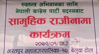 भरतपुरका कांग्रेस कार्यकर्ताले स्वतन्त्र अभियानका लागि भन्दै घोषणा गरे सामूहिक राजीनामा