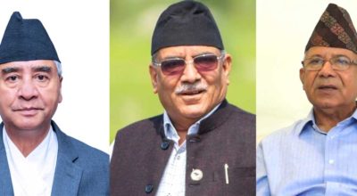 प्रधानमन्त्री देउवा, माओवादीका अध्यक्ष प्रचण्ड र नेकपा एसका अध्यक्ष नेपालबीच भेटवार्ता