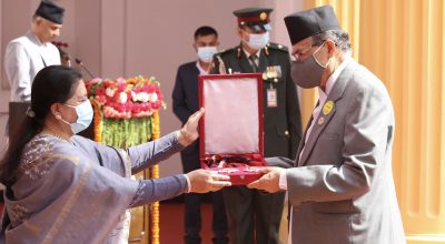 पूर्वप्रधानमन्त्री ओली ‘मेधावी योगदान’ उच्च पदकबाट सम्मानित हुनुहुँदै